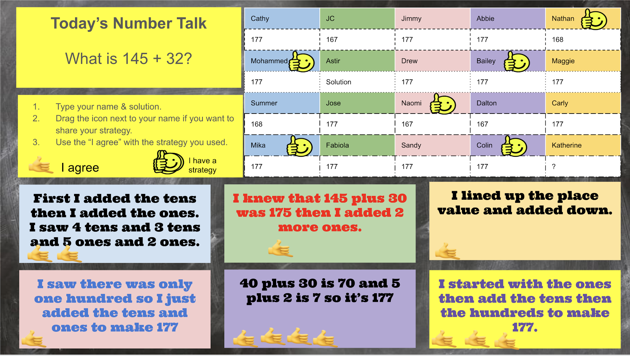 1. Google Slides: During a synchronous meeting with your students share this slide deck in edit mode for students to record their solution to a number talk problem. Students can drag the icon to indicate they would like to explain their thinking or to show agreement with another student’s explanation.