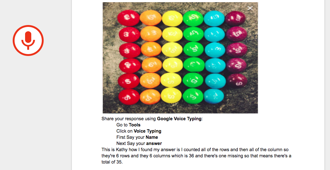 2. Google Voice: For asynchronous collaboration post an image and/or your question in a Google Doc. Students can work with a partner or independently to share their strategy. All you need to do is create a Google Doc and Share with your students. Then have your students go to the Tools Menu in the Document and click Voice Typing