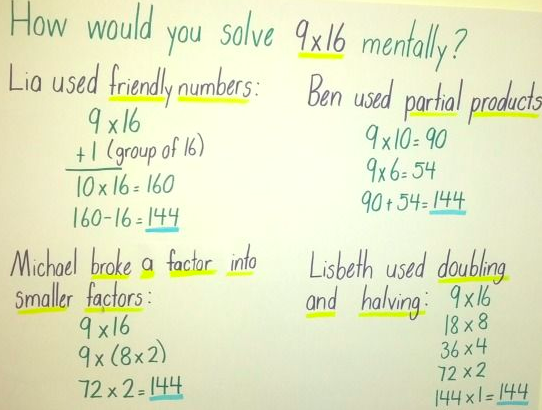 The conversation that occurs after the number talk is teacher facilitated with students sharing answers and their strategy. This process supports students learning from each other and teachers assessing students thinking and what strategies they use naturally.